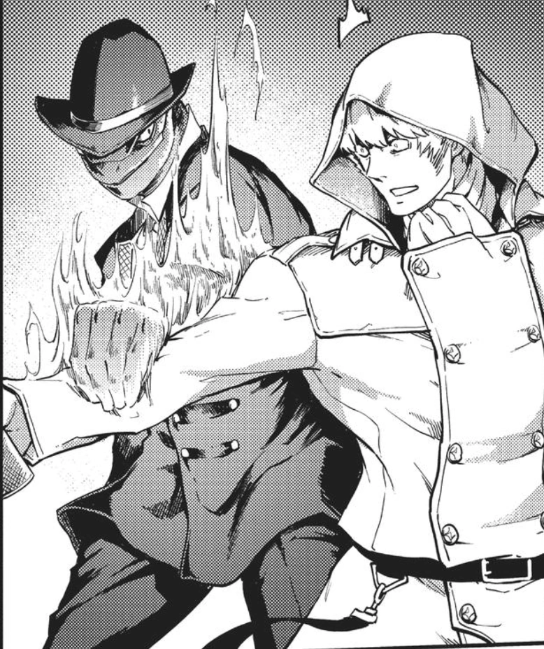 Fire Generation: His body fluid can burst into flame when exposed to air. This flame cannot be extinguished by water. It is unknown whether this body fluid is sweat, blood or something else. The fluid can be shot and spray from his fingertips or anywhere on his body, making it an effective short range attack. In battle, he usually cover himself in fire and attack up-close.